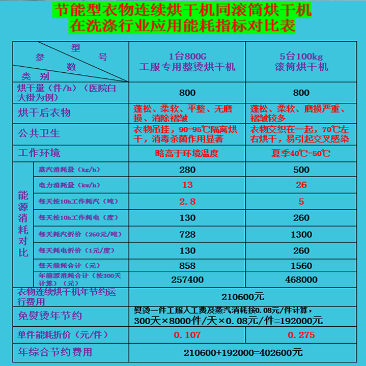 每小時可以烘干衣物800—1000件,消耗蒸汽量低于300KG,每年可為用戶節(jié)約大量蒸汽資源。比同類產(chǎn)品節(jié)能30%以上。每年可為用戶節(jié)約大量能源類剛性成本支出。